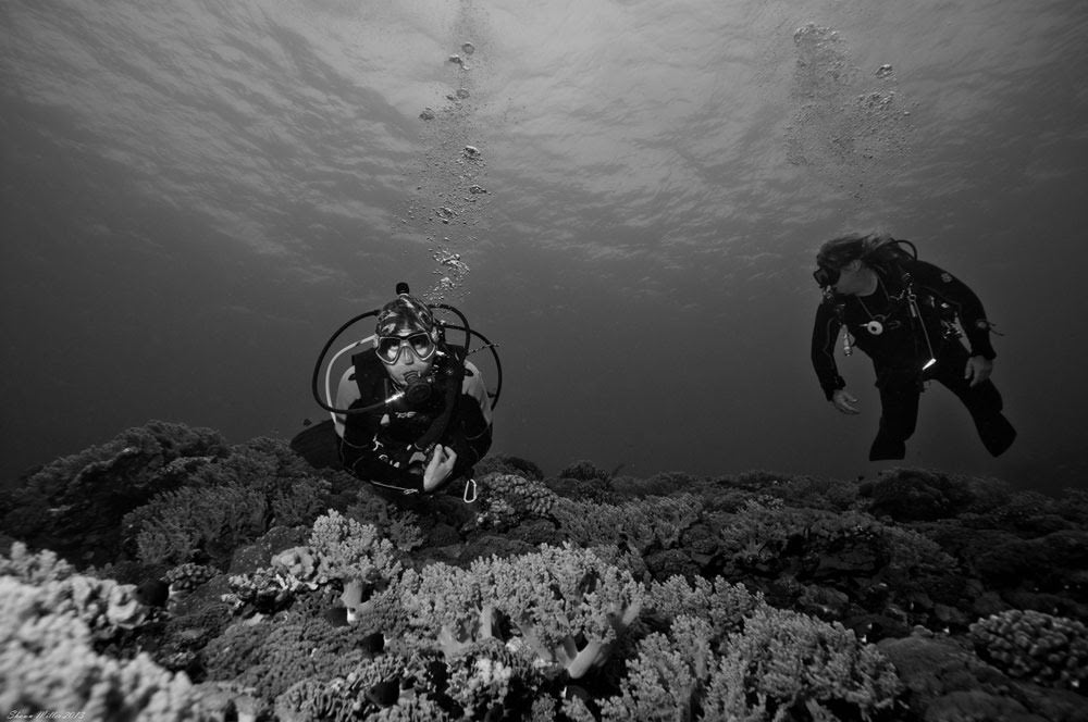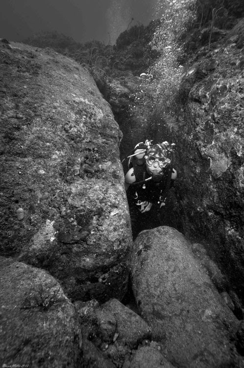 São mergulhos de dificuldade mediana devido as correntes, porém a visibilidade é incrível. Creio que em alguns pontos tínhamos 40m mesmo com o tempo nublado. A paisagem submarina chama muita a atenção, a areia é branquíssima, as rochas da costeira são escuras, com corais (que não são muitos porém muito bonitos) e cardumes coloridos e muitas passagens. Essa talvez a maior diversão dos primeiros mergulho.