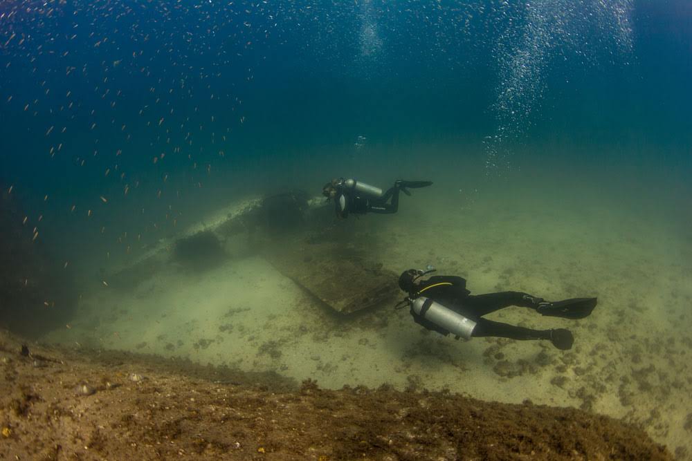 Embarcação da Paraty Scuba ao lado do naufrágio do avião – Foto: Clécio Mayrink