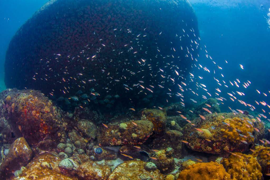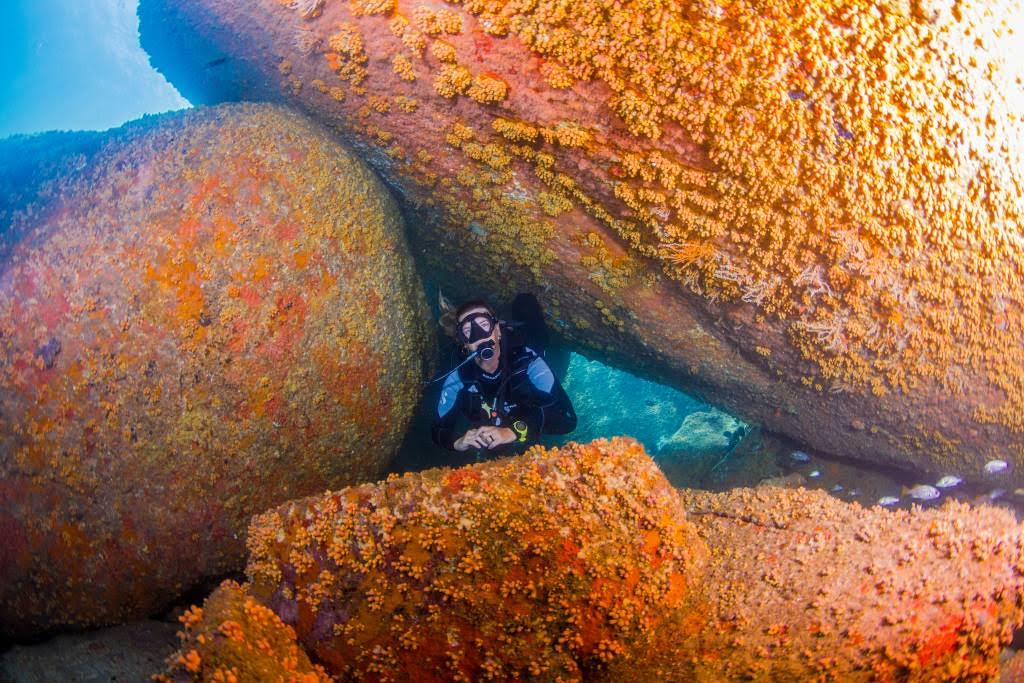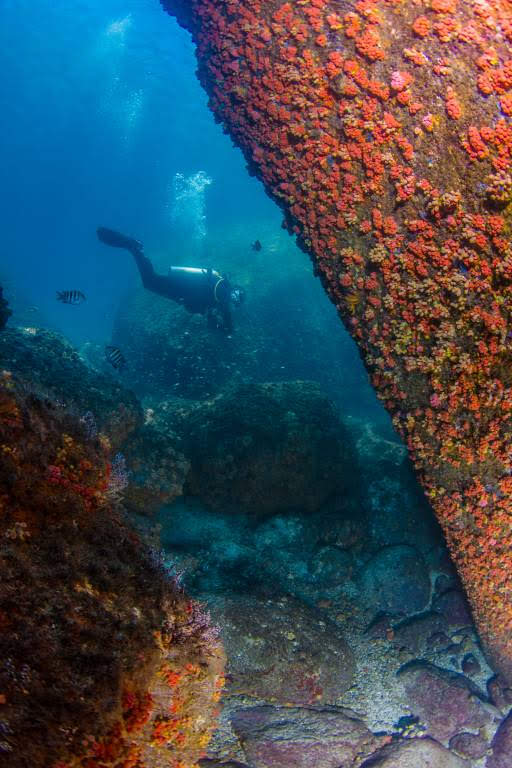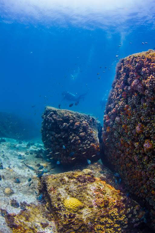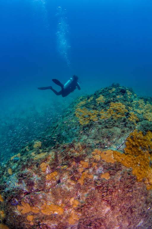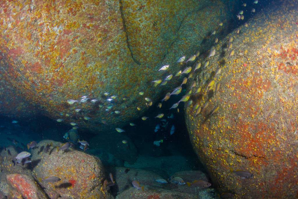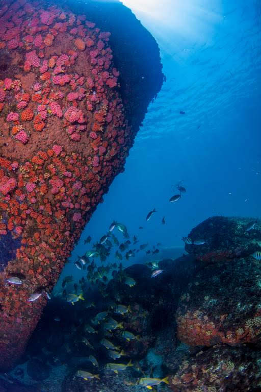 Mergulhar nas proximidades desse naufrágio também revela algumas belezas naturais, sendo possível esbarrar com pequenos seres marinhos e um colorido bem atraente. Passamos por algumas “cavernas”, que melhor dizendo, são aglomerações de grandes rochas e que permitem a passagem dos mergulhadores e a descobertas de inúmeras espécies de peixes que se escondem entre as sombras.