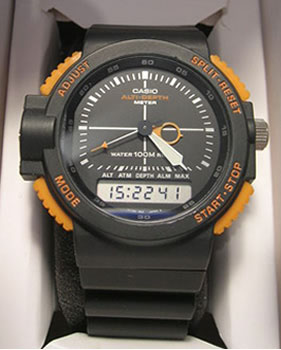 O primeiro relógio que se têm notícia com profundímetro é realmente o C0023, vulgo Aqualand, da Citizen. O segundo relógio foi o Casio AWR320, um relógio com profundímetro, altímetro e barômetro, lançado em 1990 no Japão.