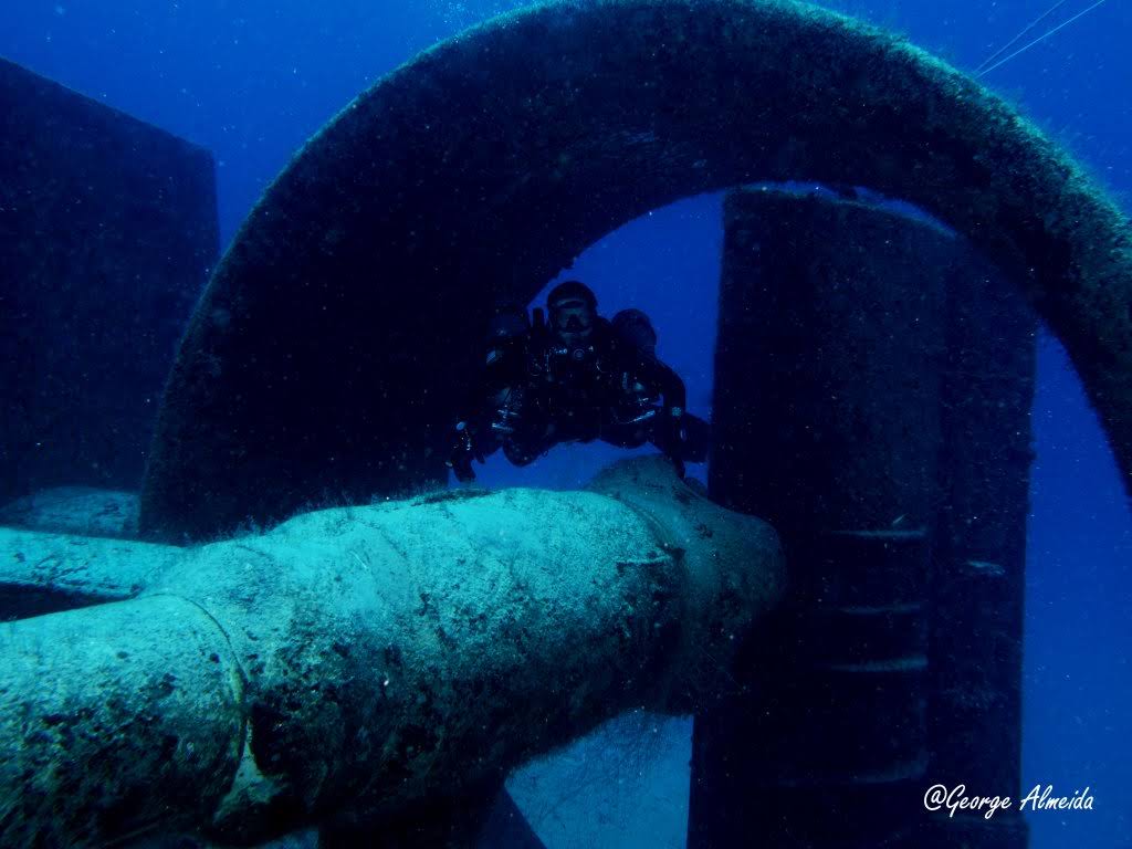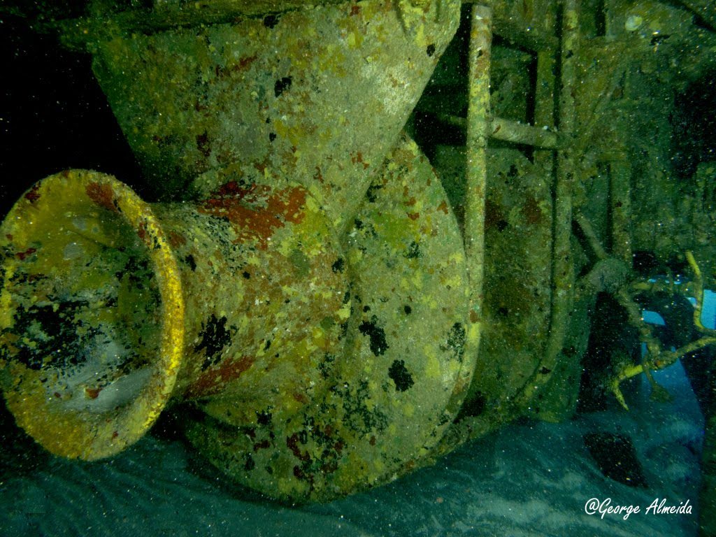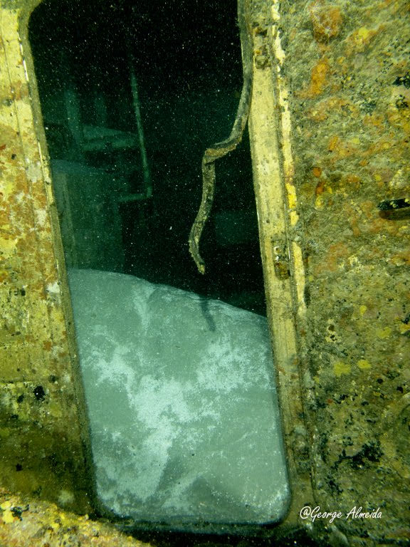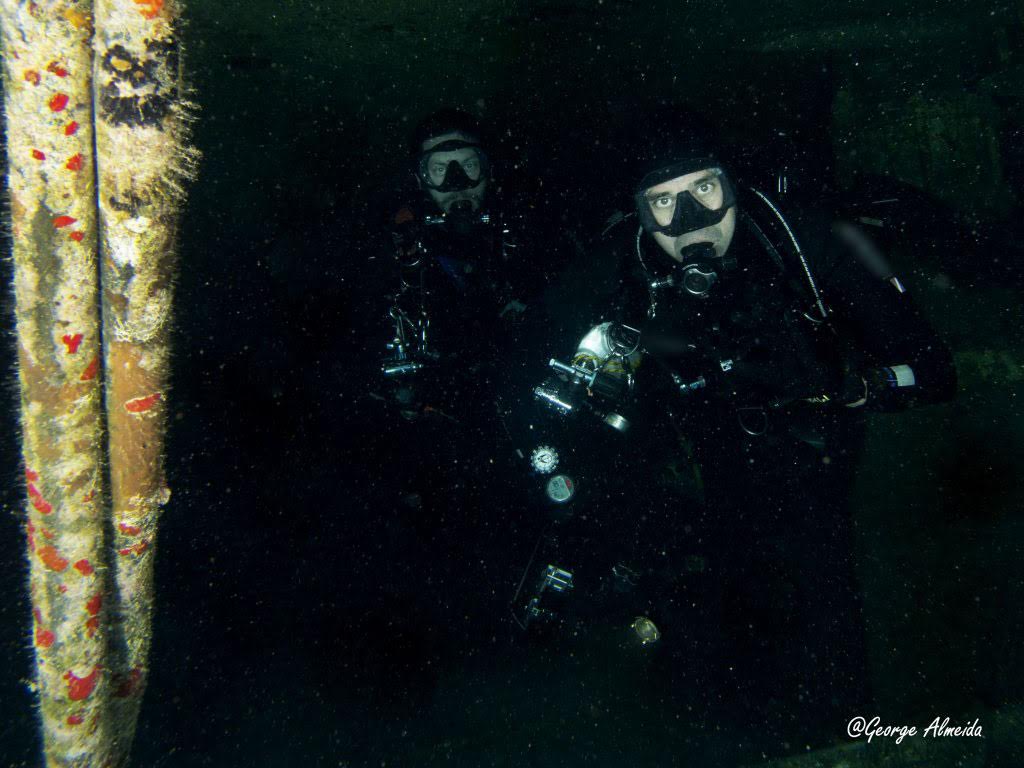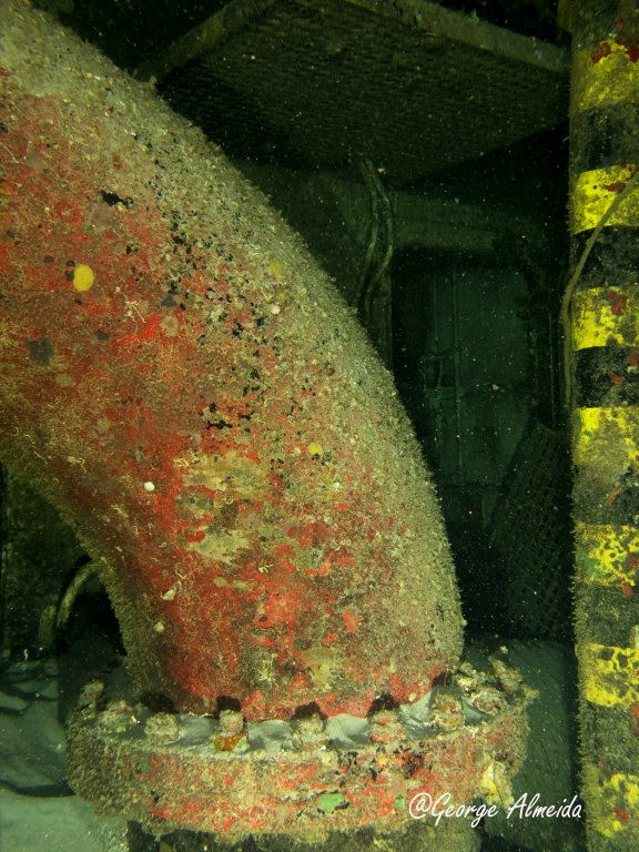 Lá dentro foi possível identificar um quarto devido ao que restou das camas, banheiros com as privadas no teto ao estilo “Itapagé“. Cilindros de Oxigênio caídos e muitas peças ainda muito instáveis do casario que emborcou e depois foi esmagado quando o naufrágio se chocou contra o leito marinho.