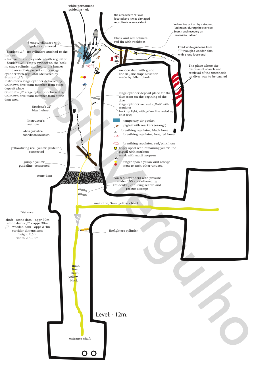 O Aluno 1 e o Instrutor têm máscaras no pescoço. O computador do instrutor indica que ele estava sob o teto por um longo tempo, provavelmente perto da bolsa de ar, antes de seu corpo afundar até o fundo (quase 5h desde o início do mergulho).