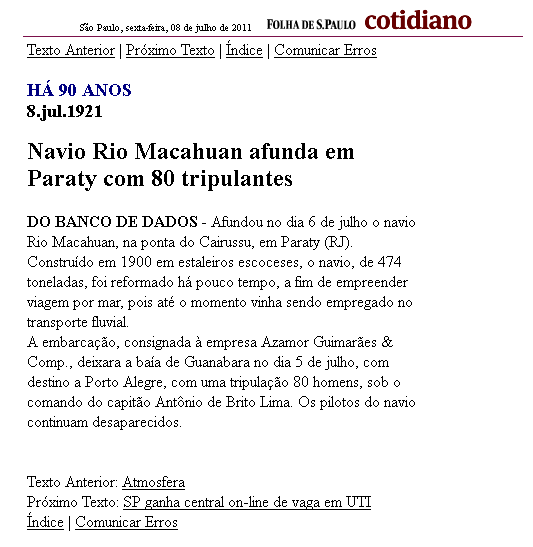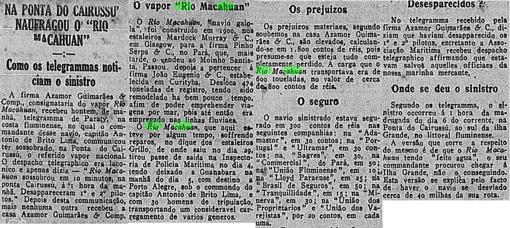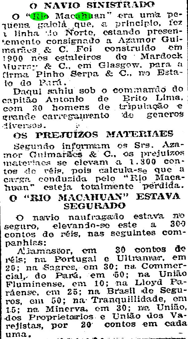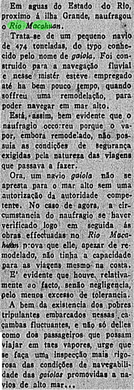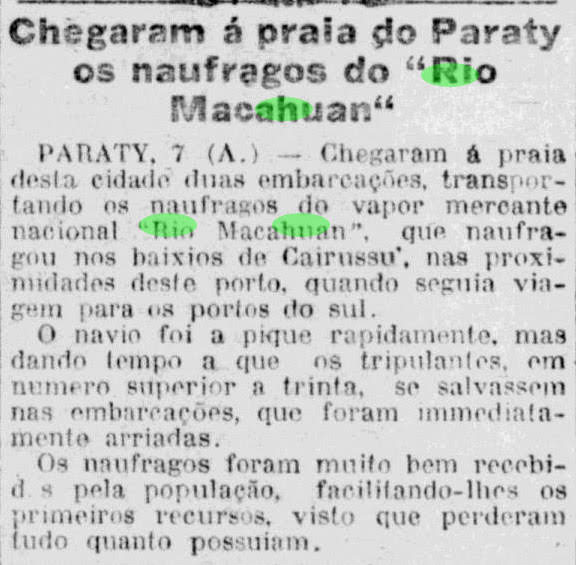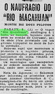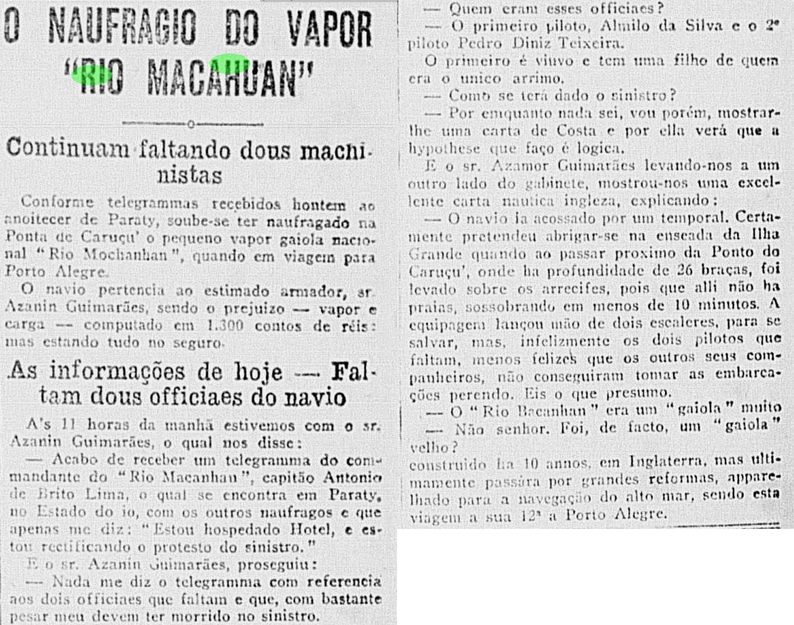 Notas: Deixara a baía de Guanabara no dia 5 de julho, com destino a Porto Alegre, com uma tripulação 30 homens, sob o comando do capitão Antônio de Brito Lima. Os pilotos do navio não foram encontrados. A tripulação se salvou nadando até a terra. O navio afundou em 10min.
