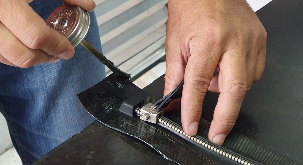 Após a realização dos passos anteriores, chegou a hora de colar o zíper na roupa, então, é preparada uma cola específica para essa fixação do zíper, utilizando um produto importado. Parece que algumas pessoas andam utilizando um tipo de cola de contato especial, no entanto, é sabido que o resultado final não é o mesmo. A cola utilizada pelo pessoal da Scuba Repair foi adquirida nos Estados Unidos, sendo um produto importado, relativamente caro e complicado de ser trazido para o Brasil, por ser inflamável.