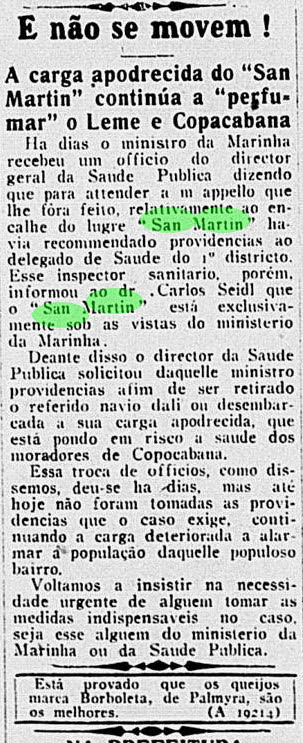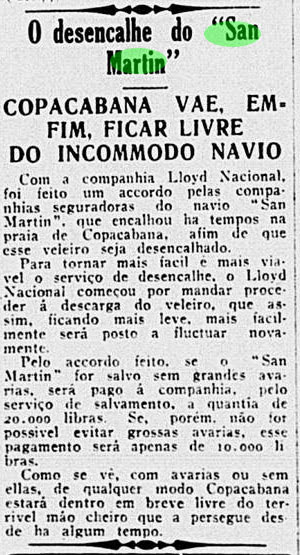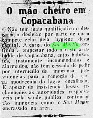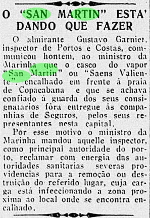 O San Martin encalhou na altura das ruas Belford Roxo e Goulart (atual Prado Júnior) e transportava além dos 19 tripulantes, um carregamento de carne bovina, que acabou apodrecendo no local e gerando um mau cheiro na região.