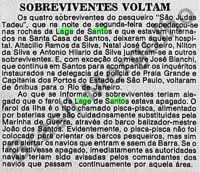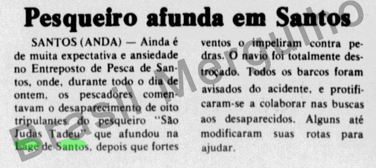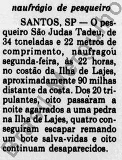 Notas: Doze tripulantes se salvaram e 8 desapareceram no mar. A embarcação possuía 34T.