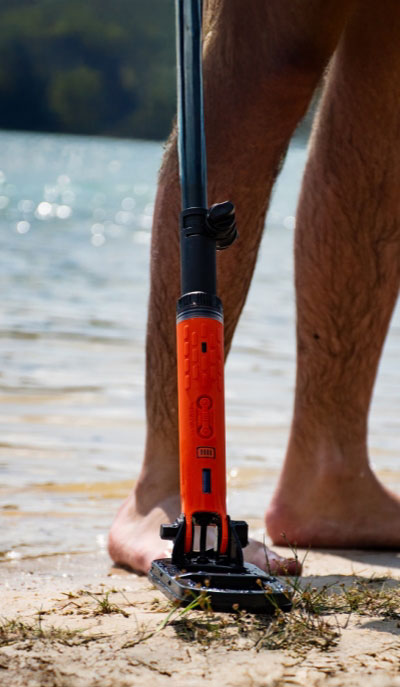 Em sua parte traseira, há uma rosca para a fixação de um bastão, que permite o uso do Scuba Tector Pro na praia ou em terrenos fora da água.