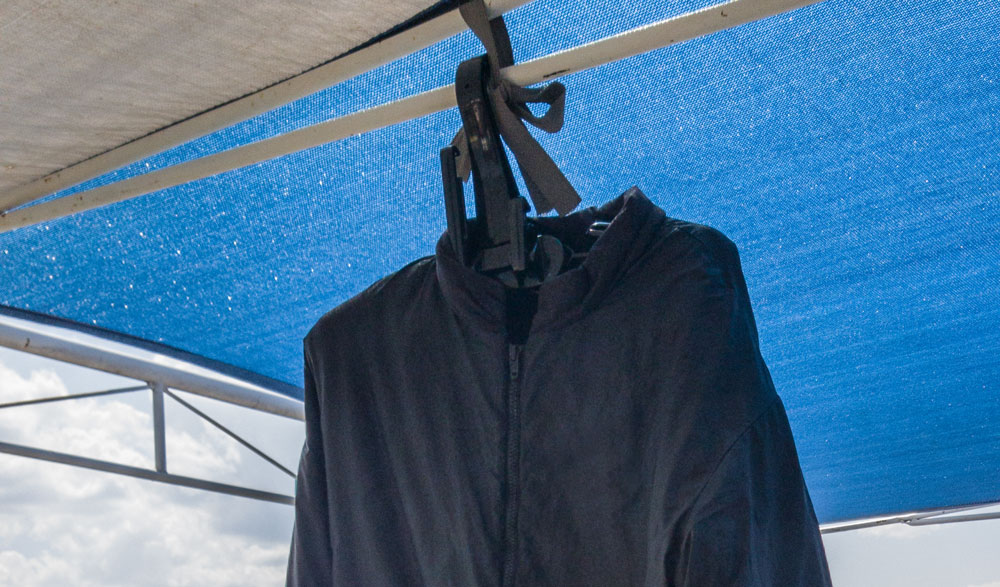 Caso a navegação seja longa, veja se é possível deixar a roupa de mergulho fixada em algum local da embarcação, utilizando um cabide. Existem cabides para roupas de mergulho no mercado com possibilidade de serem dobrados, o que facilita muito transporte deles e a diminuição de volume nas bagagens de mergulho, inclusive.