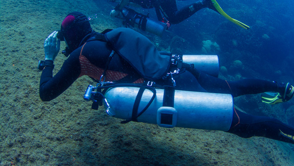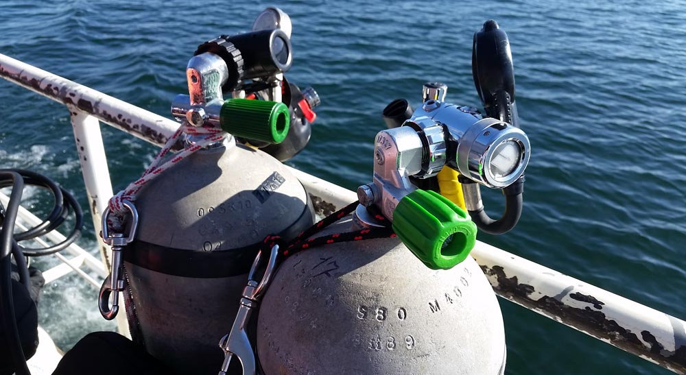 Um dos equipamentos mais importantes nessa configuração, obviamente são os manômetros dos cilindros, que normalmente ficam rentes ao corpo do mergulhador para que não se enrosquem em algo, evitando a possibilidade de um vazamento repentino por algum dano a mangueira.