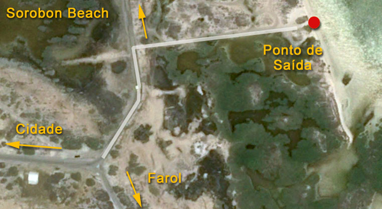 Ao entrar na avenida que dá acesso a Sorobon Beach, alguns metros depois viramos à direita em uma pequena estrada de terra (GPS 12 5.356” N / 68 14.124” W), e seguimos por 160m aproximadamente até alcançar uma área mais larga que dá acesso a uma praia.