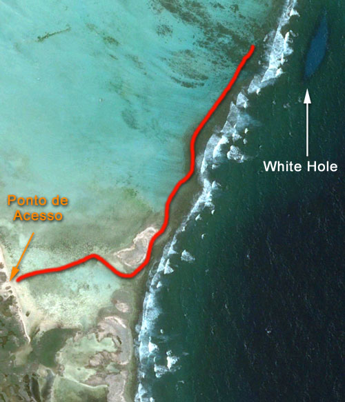 A ideia era ir nadando até o conhecido ponto denominado White Hole, uma formação rochosa com um buraco no meio, distante aproximadamente 800m do ponto de partida, que fica em uma praia deserta e próxima da região de Lac Bay, onde está Sorobon Beach, uma das praias mais famosas de Bonaire.