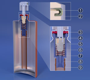 Quando o usuário pressiona o botão na parte superior do frasco, ele aciona um pequeno sistema que cria uma pressão interna, fazendo com que ocorra a expulsão do conteúdo líquido em forma de vapor para fora do frasco.