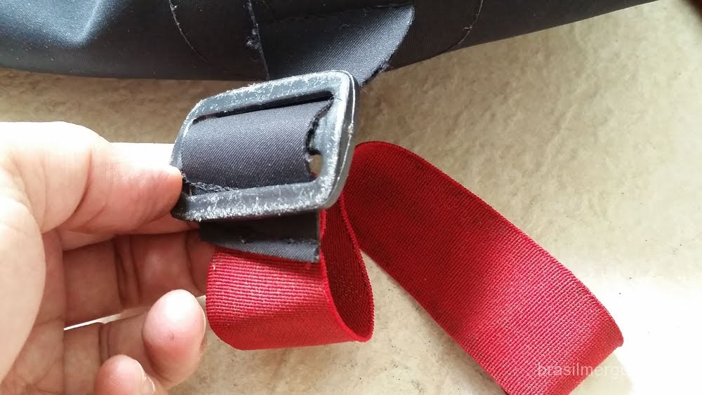 Para a substituição normalmente é preciso desfazer a costura das bases onde a ponta do elástico é fixado, para costurar o novo elástico. No meu caso, decidi desfazer a costura dessa base e remover o elástico antigo, e colocar um passador no lugar, pois dessa forma, futuramente poderei substituir o elástico de forma rápida e sem precisar de ninguém, mas é uma escolha pessoal.