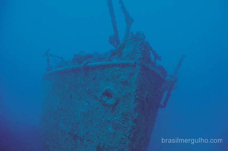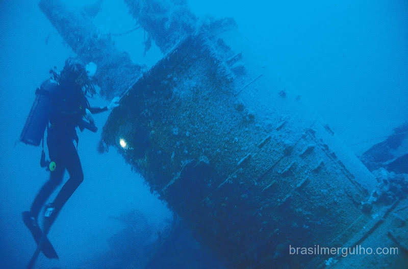 Uma âncora foi lançada no fundo arenoso e através do cabo descemos pela parte mais rasa do navio, que está aos 12m, e a partir daí atingimos a parte mais funda aos 30m. A visibilidade estava ruim por causa da localização do navio, praticamente na areia da praia, mas não deixa de ser um belo mergulho, principalmente pra mim, por ser meu primeiro num navio tanque, talvez o maior de todos os naufrágios que visitei até então.