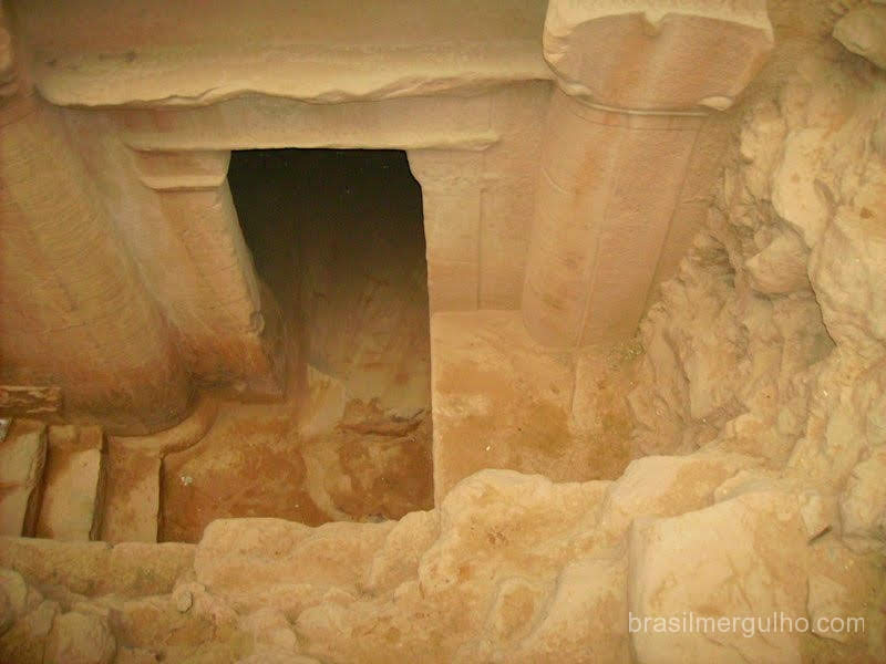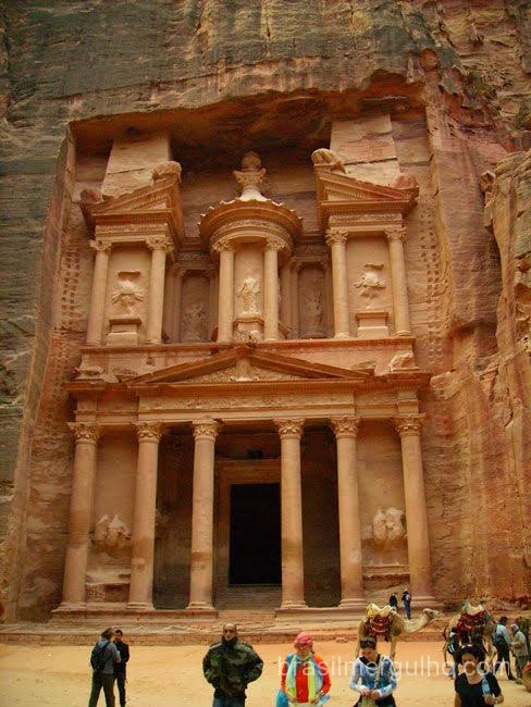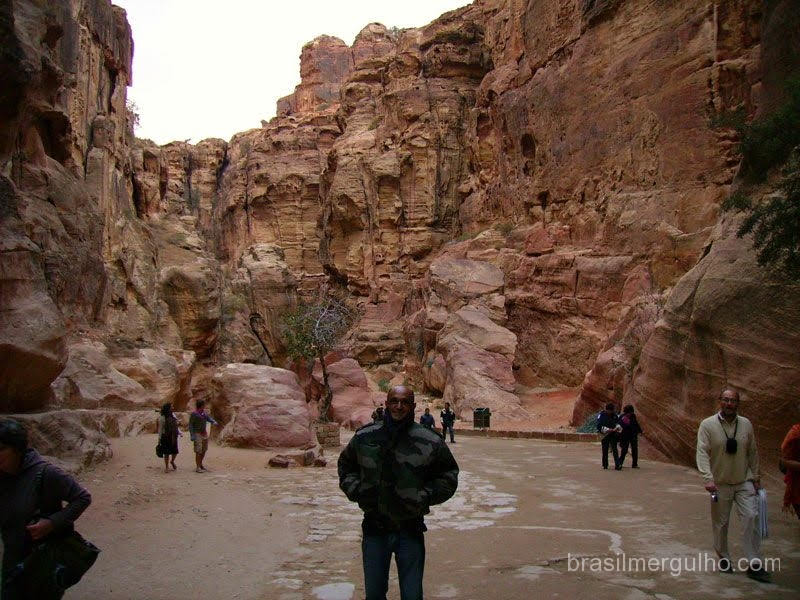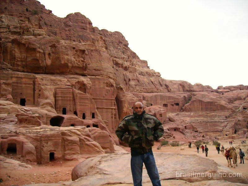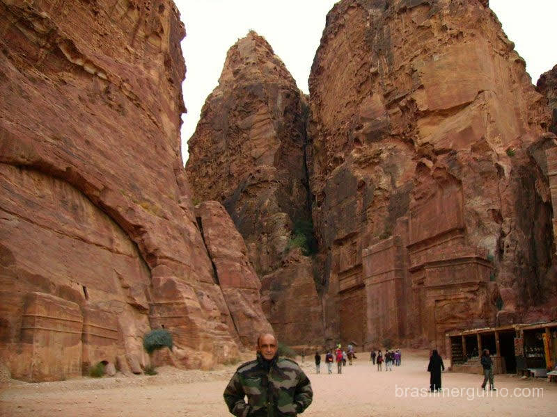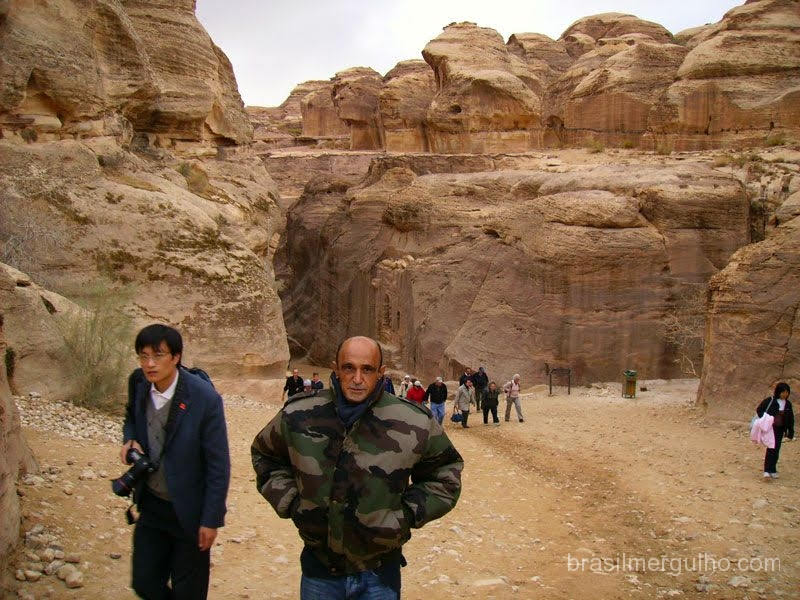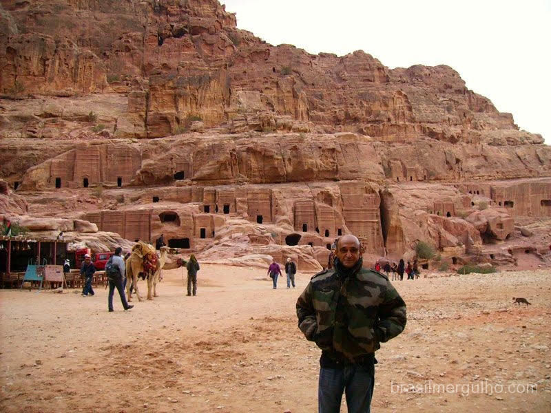 da Jordânia numa viagem de 360Km. Chegamos a Petra, e pude admirar as belezas da arquitetura romana, descemos a pé por um caminho recoberto por cascalho, encravado em gigantescas rochas, que nos levou ao coração do local, uma hora para descer e outra para subir, o que fizemos praticamente correndo, pois não há iluminação. De volta ao táxi, com mais duas horas de viagem chegamos a Aqaba, um lindo balneário jordaniano, as margens do Mar Vermelho, bem no final do golfo que empresta o nome a cidade.