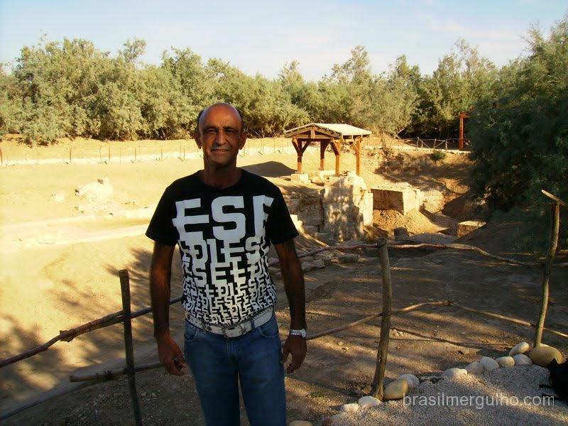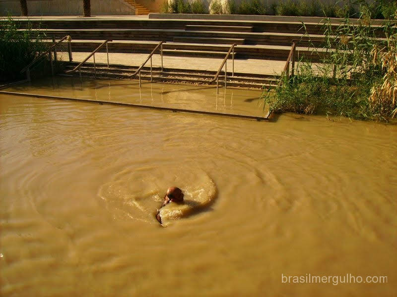 Após o desjejum, tomo um carro com motorista e rumo a realização de mais um sonho: Banhar-me nas águas do rio Jordão. A imagem que fazemos dele é a mesma do conceito dos grandes pintores renascentistas, um largo e manso rio com águas de coloração azul. Na realidade, é estreito e barrento, dada a alta concentração de areia do deserto dissolvida em suas águas.
