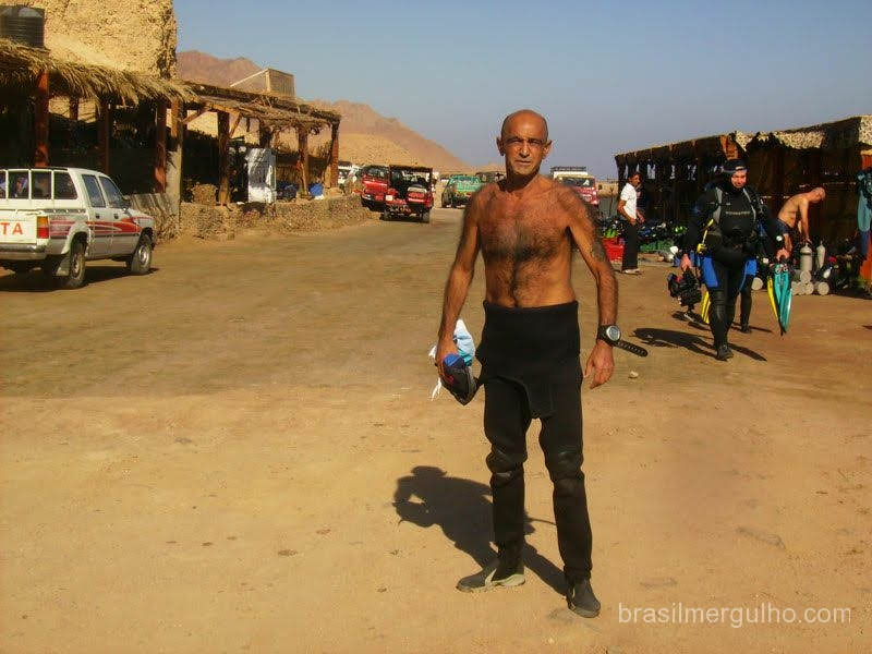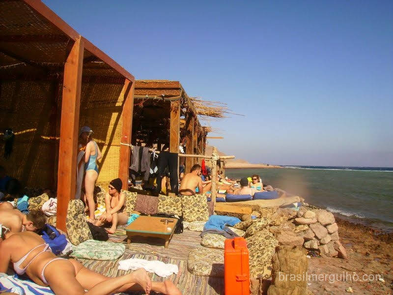 O serviço de bar é com direito a entrega no barraco. Aproveitei para dar uma volta pela praia, entre as barracas dos mergulhadores de todo o mundo, que para lá convergem, foi aí que percebi a grande quantidade de gente. Grande quantidade mesmo, pois nunca vi tantos mergulhadores juntos em minha vida. Após um suficiente intervalo, montamos os equipamentos e com eles nas costas fizemos uma longa caminhada até o local de entrada do Blue Hole.