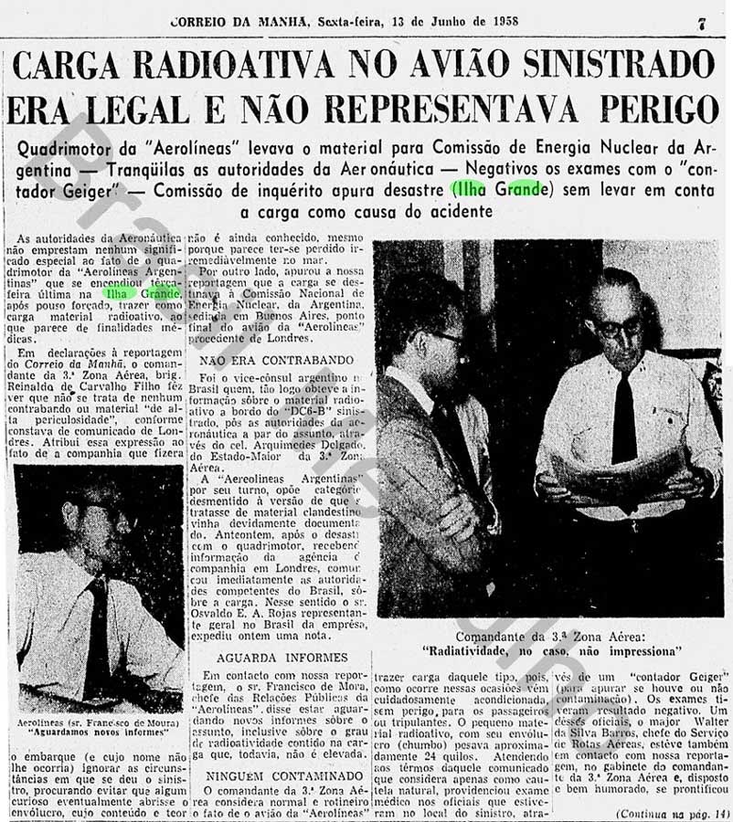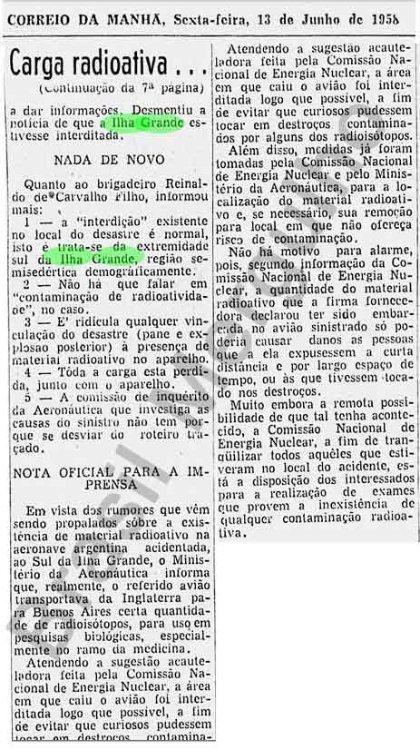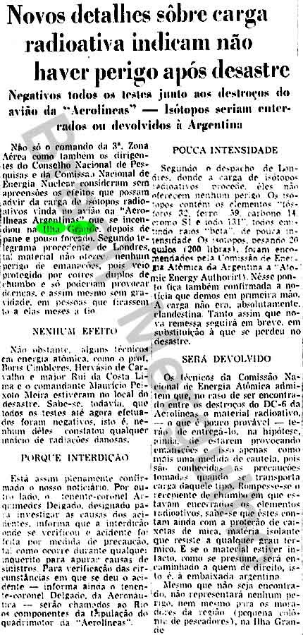 Segundo os jornais, na época a marinha brasileira teria usado detectores de radiação no local e não foram registrados índices radioativos, mas ao mesmo tempo, menciona em cobrir os restos do avião, apesar de não ter encontrado nenhuma notícia confirmando terem encontrado o avião. Uma história muito mal contada mesmo.