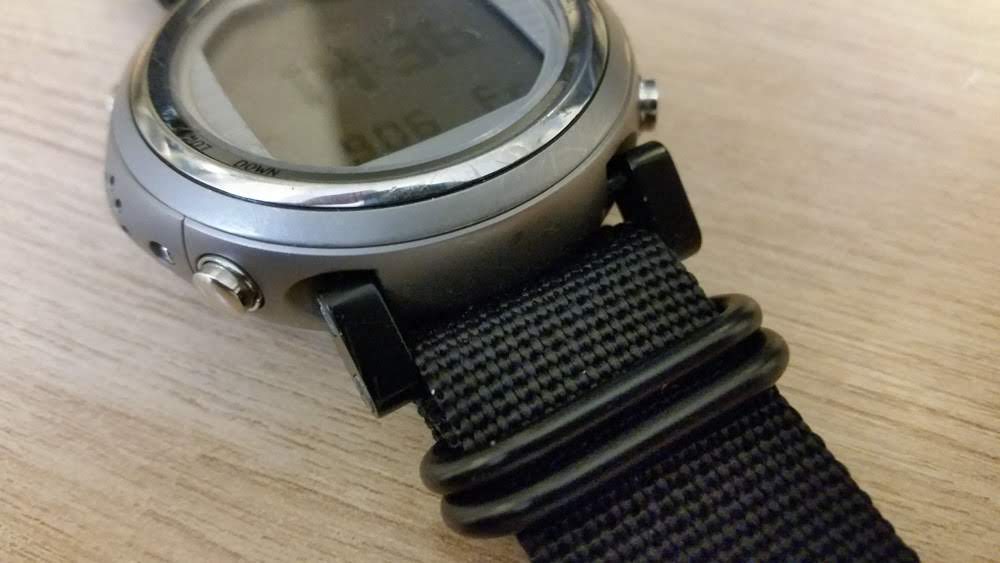 É importante lembrar que você deve comprar a pulseira em nylon e que venha com os adaptadores, que são dois pinos metálicos que permitem o encaixe da pulseira junto ao corpo do computador de mergulho.