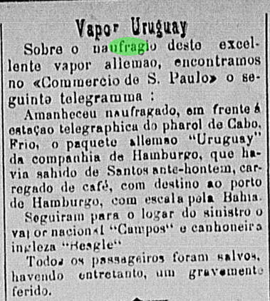 Notas: Na ocasião, o navio fazia a rota Montevidéu / Hamburgo transportando carga variada. Capacidade para 30 passageiros na primeira classe e 260 nas demais. É possível encontrar as caldeiras, o motor e a proa do navio com seu escovém.