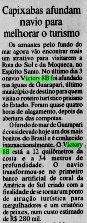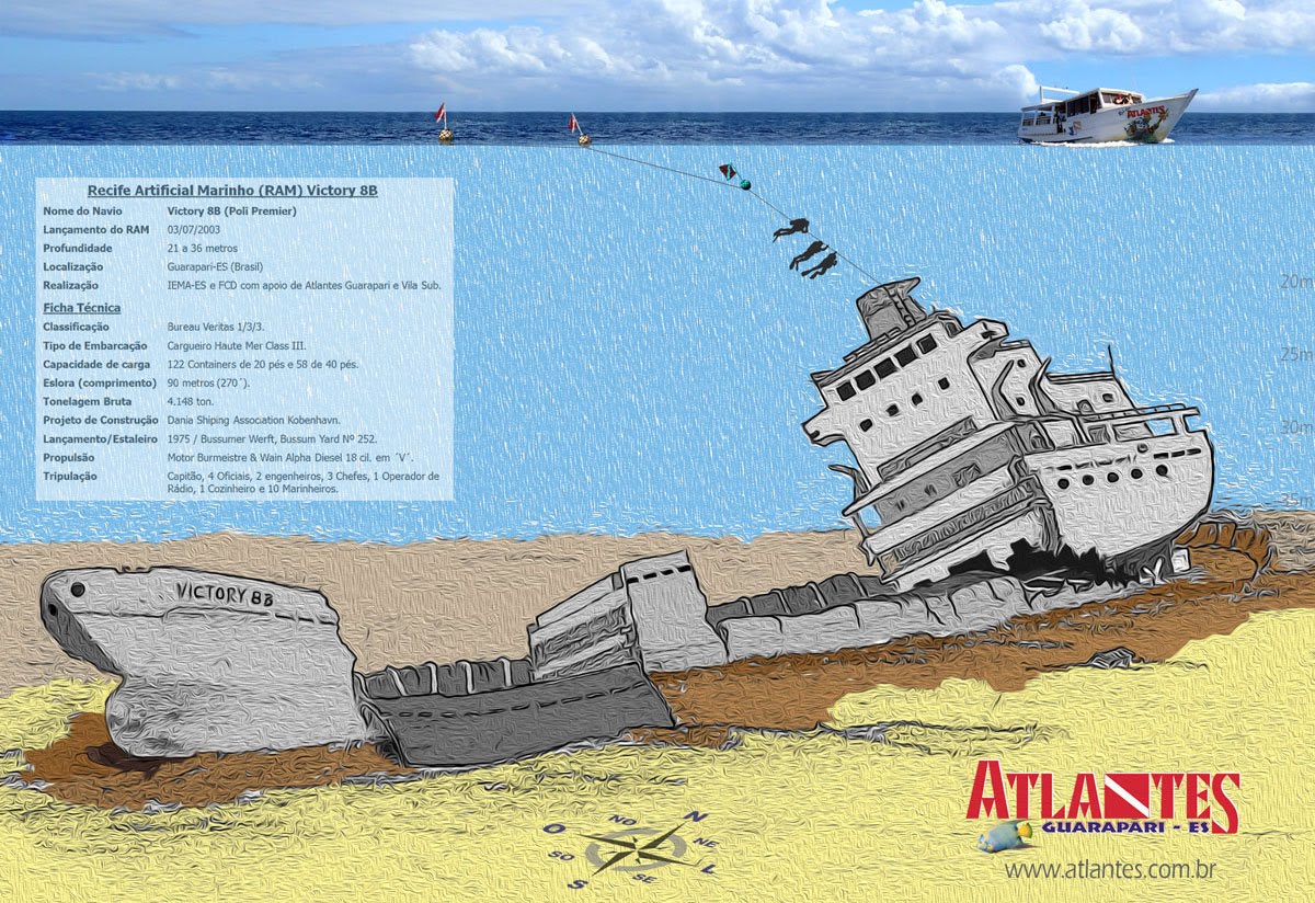 Após 3 anos de intensos trabalhos e pesquisas, finalmente no dia 03/07/2003, às 11:45h, foi concluída as 11h45, toda operação de afundamento controlado do navio Victory 8B, ficando situado entre as ilhas Rasas e Escalvadas, a 12 quilômetros do litoral de Guarapari.
