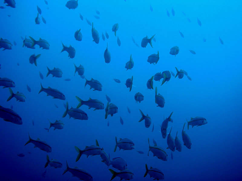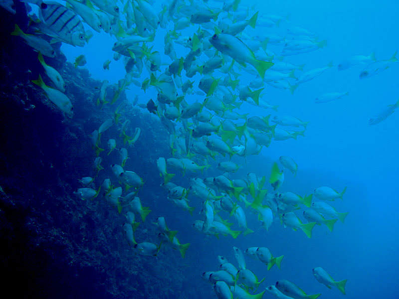 Mergulho em meio à uma forte correnteza com águas azuis. Pode ser feito para os dois lados do recife, onde atingimos a profundidade média de 30m.