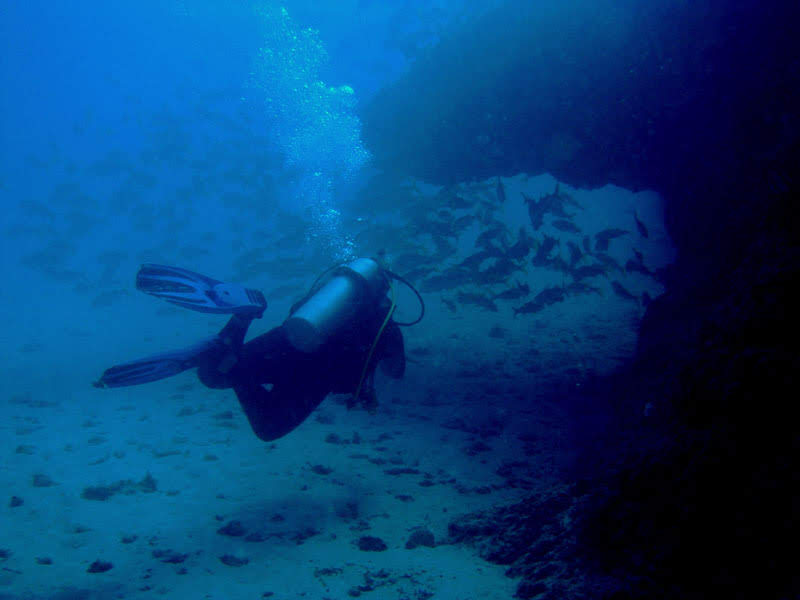 Saídas constantes e profundidade média de 18m. São três pequenas grutas, onde a maior possui um visual incrível de dentro para fora. A quantidade de peixes trombetas no surpreende nesse local.