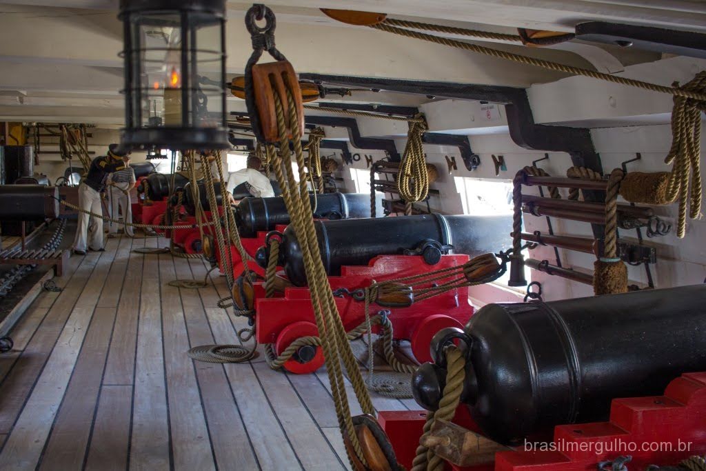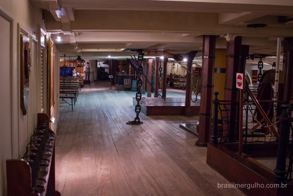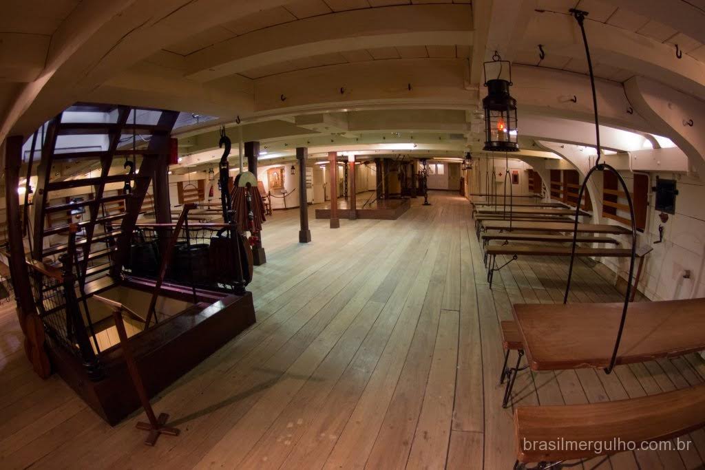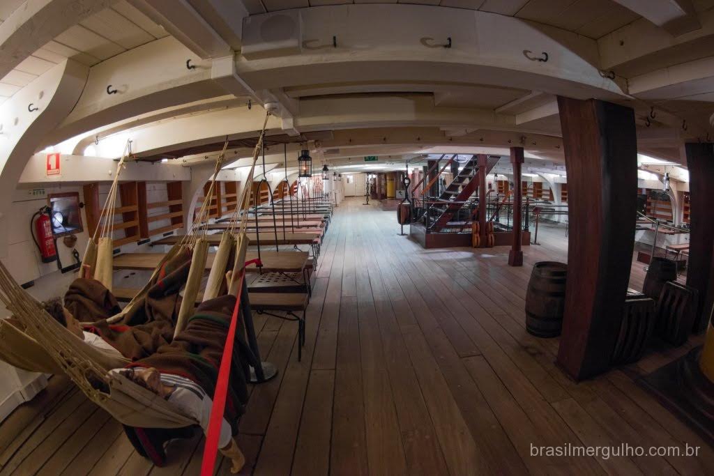Após andar por todo o convés, descemos até o primeiro andar inferior, para conhecer as demais áreas. No primeiro piso inferior, nos deparamos com diversos outros canhões com sua respectiva munição, dando uma ideia do poderia de guerra que a nau possuía. Em toda a área inferior, foram inseridos alguns manequins com as vestimentas da época, para dar uma noção de como eles atuavam no dia a dia e nas batalhas. Descendo para o segundo piso inferior, encontramos dormitórios, um imenso salão de jantar, enfermaria, casa de estocagem de pólvora, cabine do comandante e de outras patentes de grande importância hierárquica.