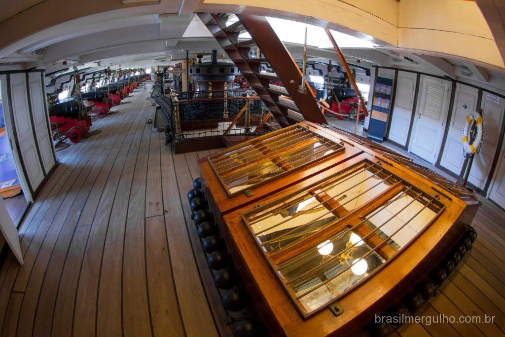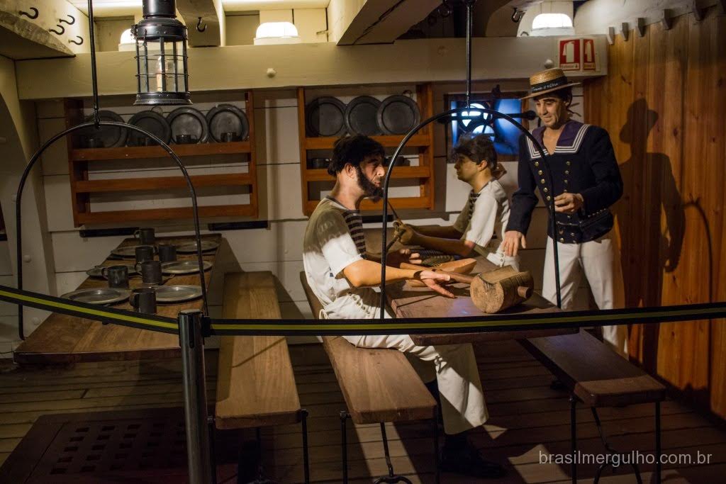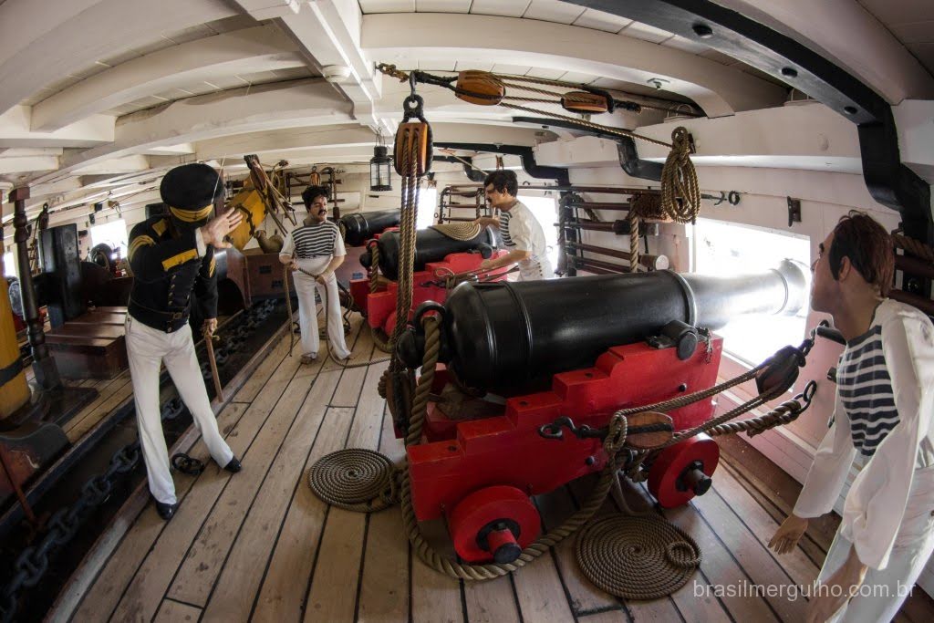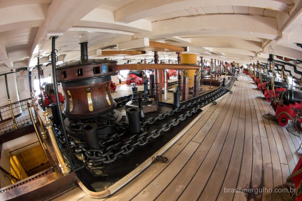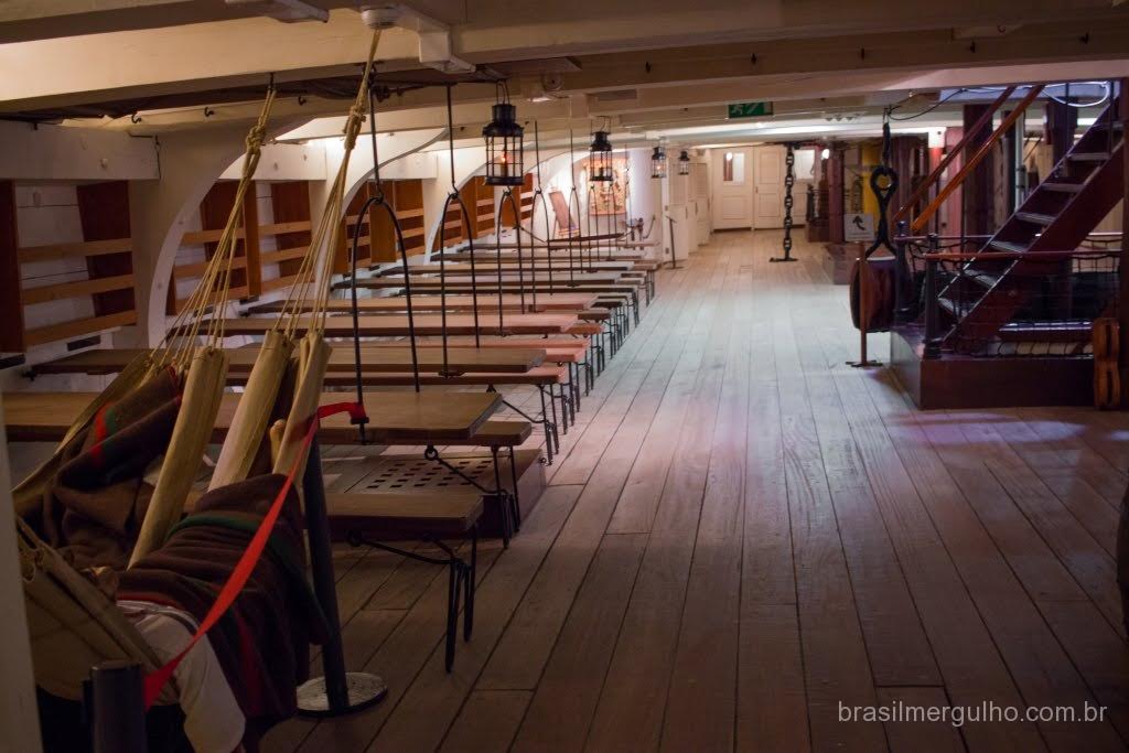 Após andar por todo o convés, descemos até o primeiro andar inferior, para conhecer as demais áreas. No primeiro piso inferior, nos deparamos com diversos outros canhões com sua respectiva munição, dando uma ideia do poderia de guerra que a nau possuía. Em toda a área inferior, foram inseridos alguns manequins com as vestimentas da época, para dar uma noção de como eles atuavam no dia a dia e nas batalhas. Descendo para o segundo piso inferior, encontramos dormitórios, um imenso salão de jantar, enfermaria, casa de estocagem de pólvora, cabine do comandante e de outras patentes de grande importância hierárquica.