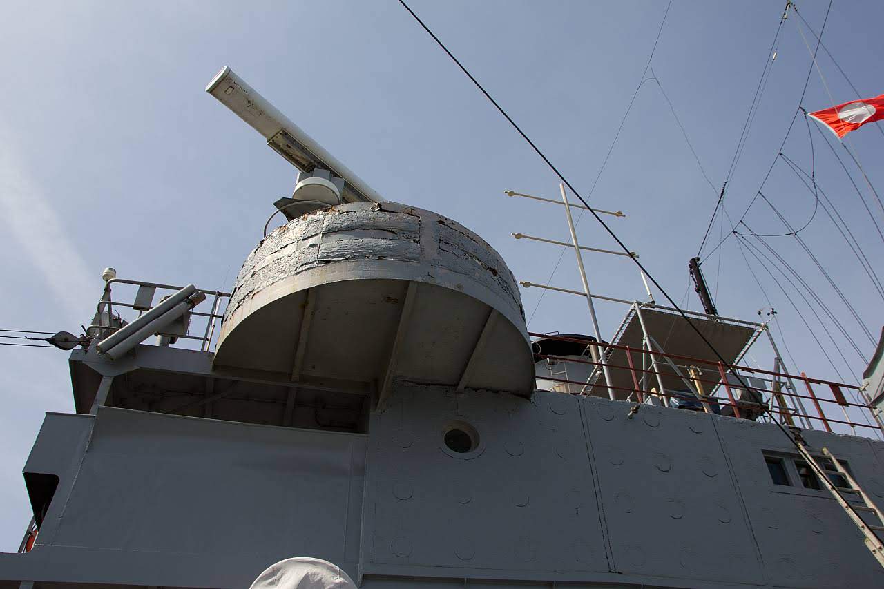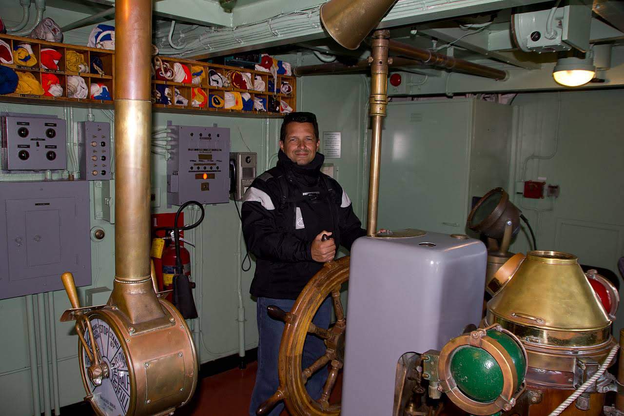 Era possível ver diversas pessoas limpando ou pintando o navio. Durante a visitação, fui abordado por um dos voluntários, que gentilmente relatou diversas informações históricas sobre o navio, me levando até a cabine de comando para tirar umas fotos na mesma e explicar em detalhes como o navio atuava.